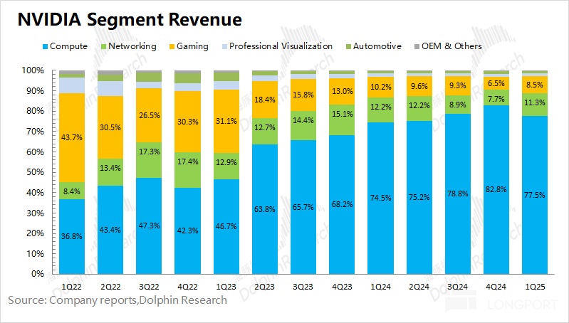 在 AI 等需求的帶動下,英偉達數據中心業務(Compute+Networking)的收入佔比已經接近 9 成,而遊戲業務的佔比被擠壓至一成以下。