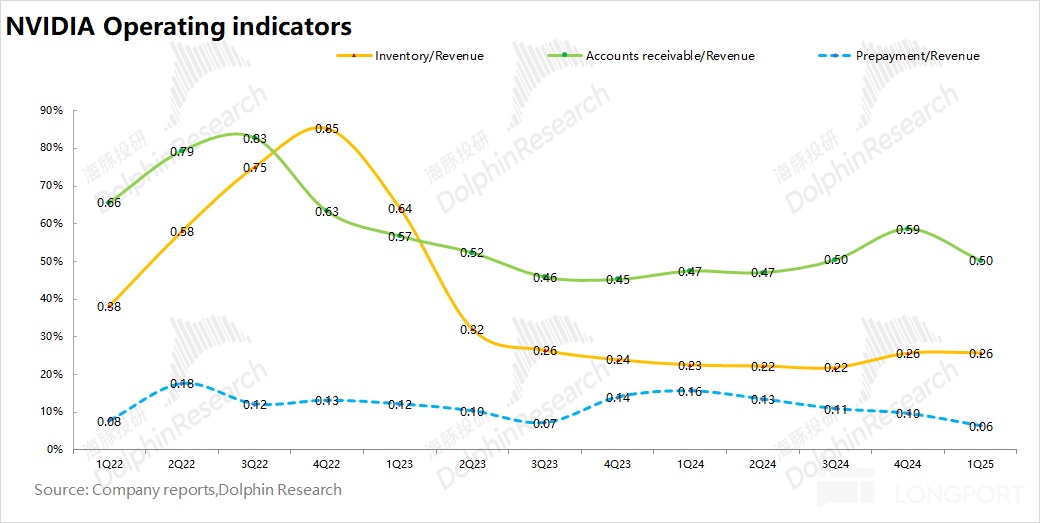 1)存貨/收入:本季度比值 0.26,環比持平。公司本季度存貨繼續提升至 113 億美元,主要是受 Blackwell 産品相關備貨的帶動。由於公司收入端仍維持在將近 70% 的高增長,公司的存貨佔比還處在相對低位。
