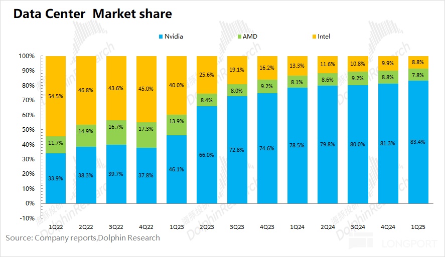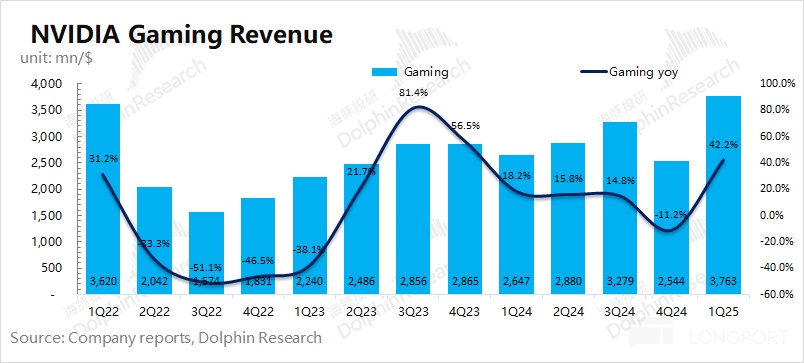 結合 AMD 的業績來看,海豚君認為英偉達本季度明顯取得了更多的市場份額。本季度 AMD 的遊戲業務再次同比下滑 29.8%,僅為 6.5 億美元。隨著公司 RTX50 係列産品的推出,英偉達在獨顯市場搶佔了更多的份額。