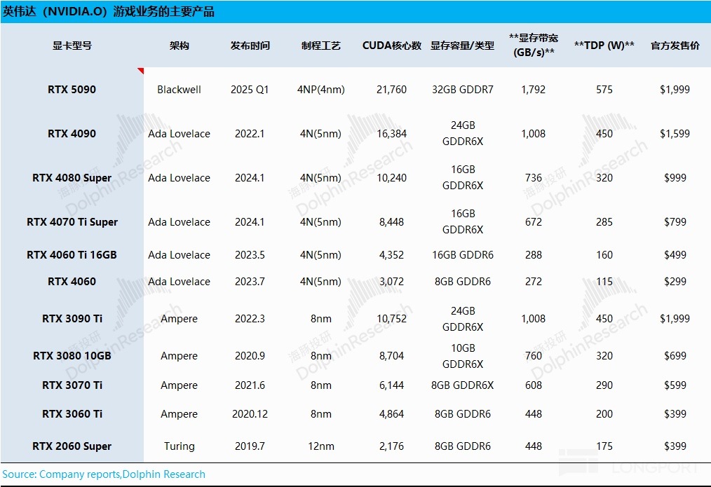 2)遊戲業務:公司在獨顯市場依舊處於領先地位,當前主要産品是 RTX40 和 RTX50 係列,主要客戶是遊戲玩家和 PC 制造商等;