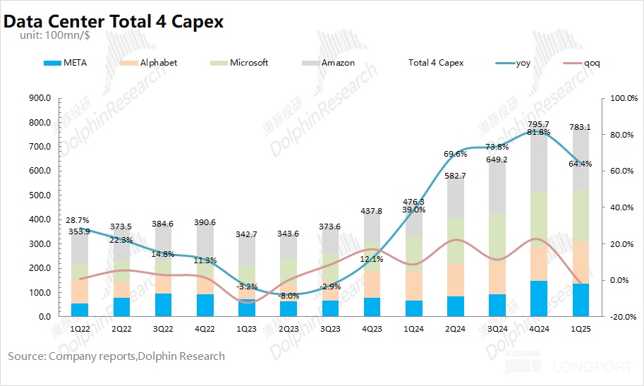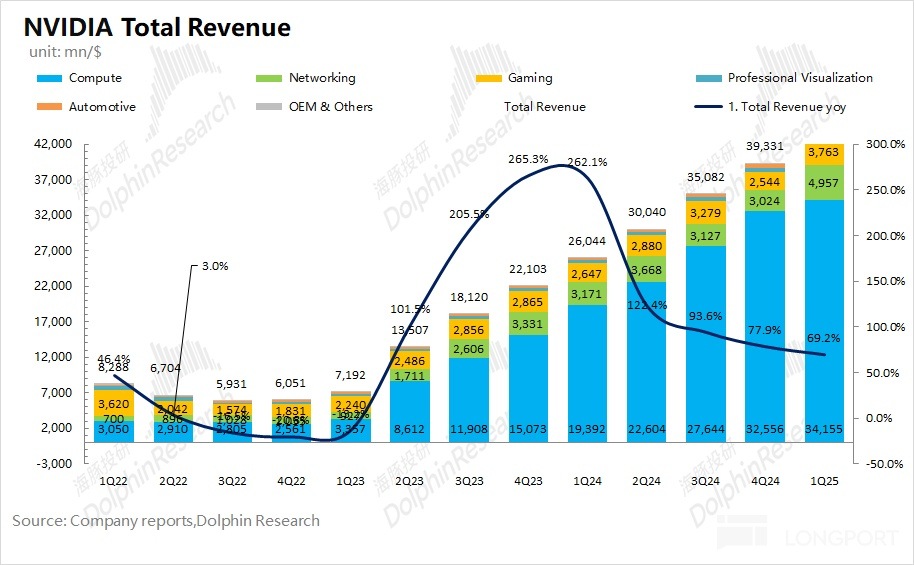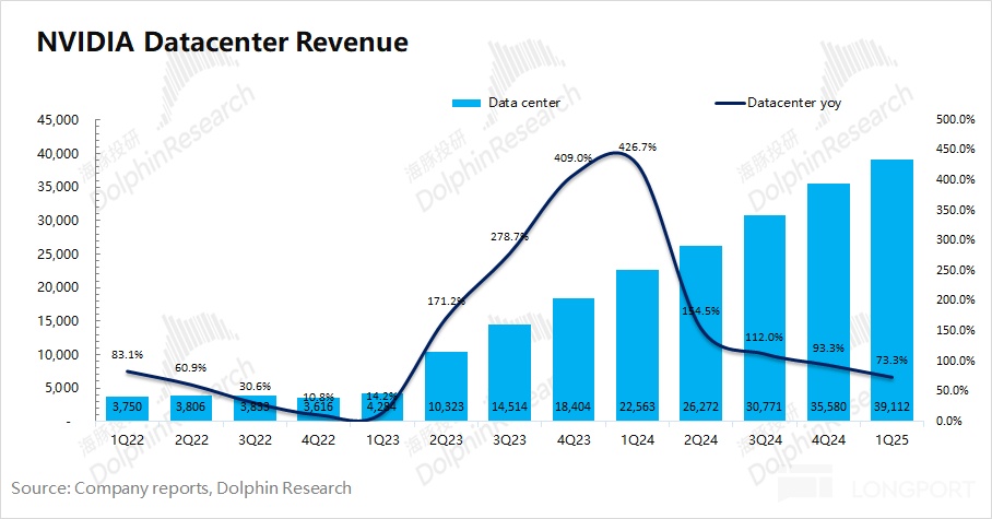 此外,2025 年一季度四大核心雲廠商的合計資本開支達到 783 億美元,同比增長 64.4%。結合公司數據中心業務 73.3% 的同比增速來看,英偉達在巨頭資本開支中的份額仍在提升。雲服務商是公司數據中心産品的主要需求方,因而雲廠商的資本開支將直接影響到公司的業績表現。通過四家公司的管理層交流,海豚君預期四大廠商在 2025 年的資本開支有望達到 3460 億美元,同比增長 38%,這給公司數據中心業務的增長帶來保障。