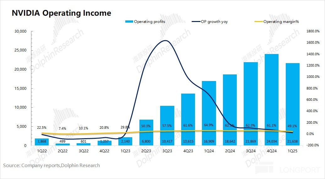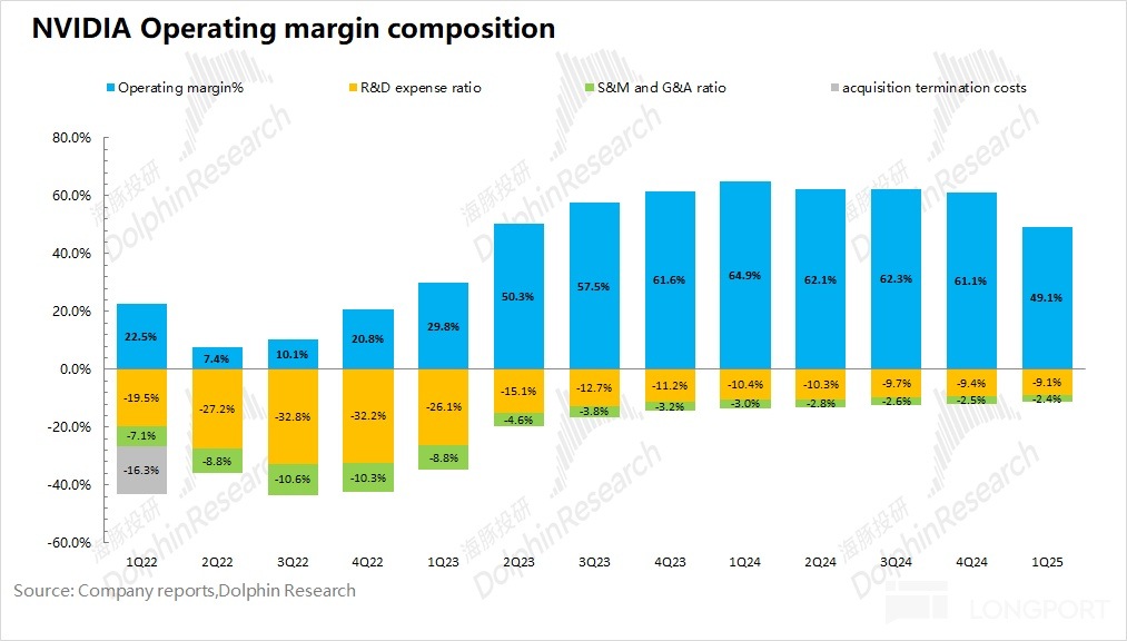 由於淨利潤還受到非經營性項目的影響,海豚君相對更關注於公司的核心經營利潤(毛利- 研發費用- 銷售、行政等費用)。公司本季度核心經營利潤 216.4 億美元,同比增長 28%。核心經營利潤率下滑至 49.1%,本季度主要是受 H20 存貨減值的影響,這方面的影響大約在 45 億美元左右。