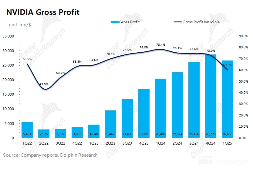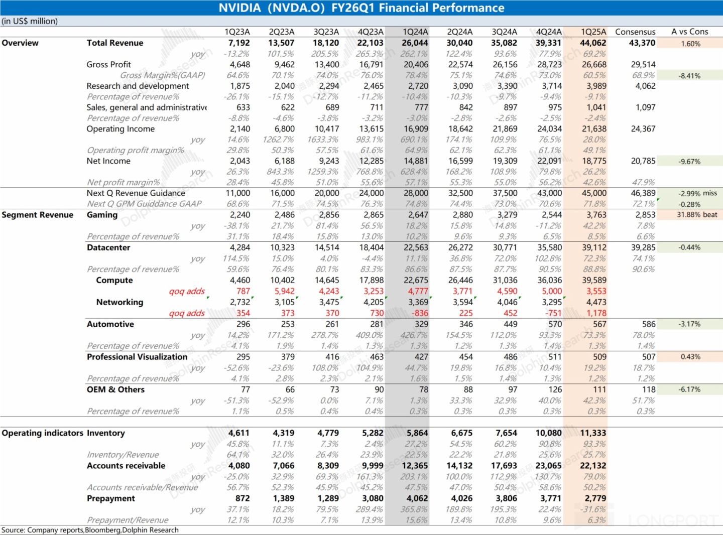 1.核心經營指標:收入 440.6 億美元,符合預期(433.7 億美元),其中季度環比增長 47 億美元,受數據中心業務和遊戲業務的帶動。毛利率 60.5%,低於預期(68.9%),其中 H20 芯片計提存貨減值大約有 45 億左右的影響。若不考慮該突發事件影響,公司本季度毛利率將回到 71% 附近。