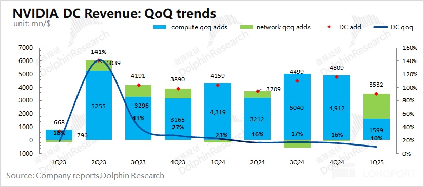 由於市場主要看重公司數據中心的成長性,因而主要關注 qoq 的增加值。從本季度的季度環比增長表現來看,本季度計算收入增長放緩至 16 億美元,而網絡收入增長提升至 19.3 億美元,從中可以看出當前下遊客戶相對期待後續量産的 GB300 産品,因而對計算方面的採購有所放緩。