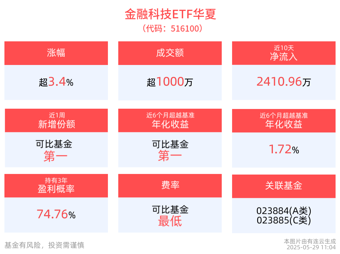 截至2025年5月29日 11:04,中證金融科技主題指數強勢上漲3.33%,成分股四方精創上漲16.30%,天陽科技上漲11.02%,恒寶股份、格靈深瞳、中科金財等個股跟漲。金融科技ETF華夏(516100)上漲3.45%,賽道漲幅居首,盤中持續溢價。