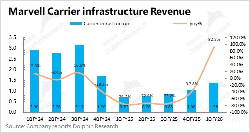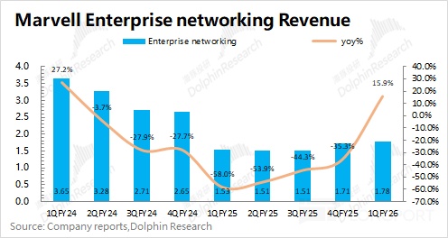 1)邁威爾科技 Marvell 在 2026 財年第一季度的企業網絡業務和運營商基建業務分別實現營收 1.78 億美元和 1.38 億美元。兩項業務本季度環比都有所回暖,反映出公司及園區的網絡産品需求、運營商的光通信芯片和 5G 基站芯片等相關需求持續復蘇。