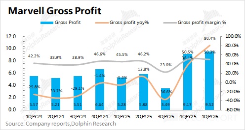 邁威爾科技 Marvell 在 2026 財年第一季度實現毛利 9.5 億美元,同比增加 80%。其中 Marvell 在本季度的毛利率為 50.3%。