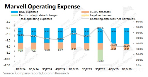 邁威爾科技 Marvell 在 2026 財年第一季度的經營費用為 6.82 億美元,與上季度環比持平。