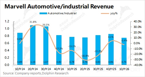 3)邁威爾科技 Marvell 在 2026 財年第一季度的汽車/工業業務實現營收 0.76 億美元,同比下滑 2.4%。公司汽車/工業業務,主要涵蓋自動駕駛、車載娛樂係統、工業機器人等領域,公司主要提供車載以太網等相關産品。盡管汽車終端市場的收入環比增長,但工業終端市場的下滑完全抵消了這一增長(工業領域的訂單模式在任何季度都可能出現大幅波動)。