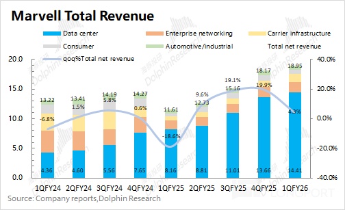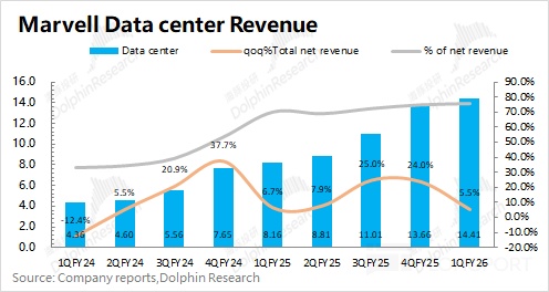邁威爾科技 Marvell 在 2026 財年第一季度的數據中心業務實現營收 14.4 億美元,環比增長 5.5%,符合市場預期(14.4 億美元)。公司數據中心業務本季度的增長主要來自於 AI 業務的帶動,主要是定制 ASIC 和光模塊 DSP 芯片等方面。