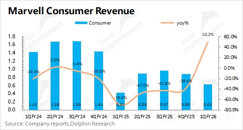 2)邁威爾科技 Marvell 在 2026 財年第一季度的消費電子業務實現營收 0.63 億美元,同比增長 50%。公司消費電子業務,主要包括存儲控制器、WiFi 芯片等産品,主要受季節性因素和遊戲需求的影響。