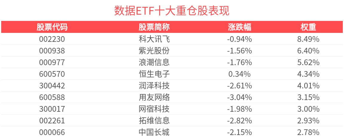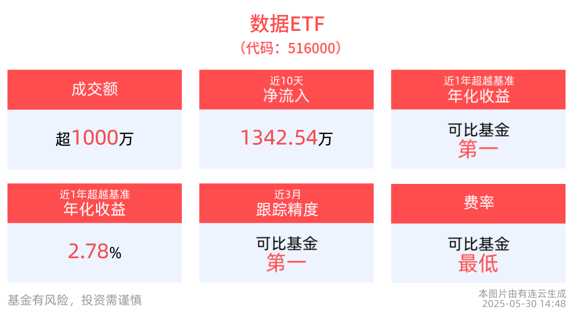 資金流入方面,數據ETF最新資金流入流出持平。拉長時間看,近10個交易日内,合計「吸金」1342.54萬元。