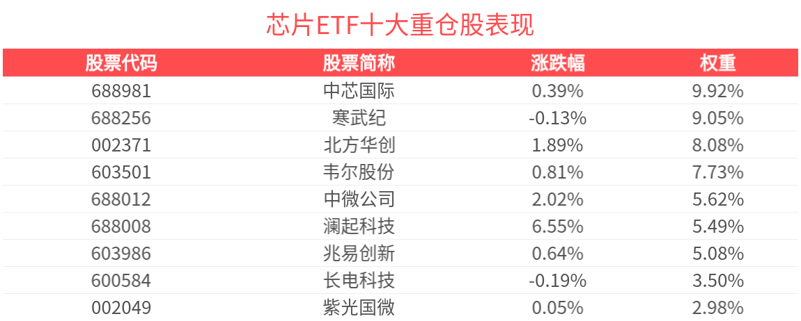 資料顯示,芯片ETF(159995)跟蹤國證芯片指數,30只成分股集合A股芯片産業中材料、設備、設計、制造、封裝和測試等龍頭企業,其中包括中芯國際、寒武紀、長電科技、北方華創等。