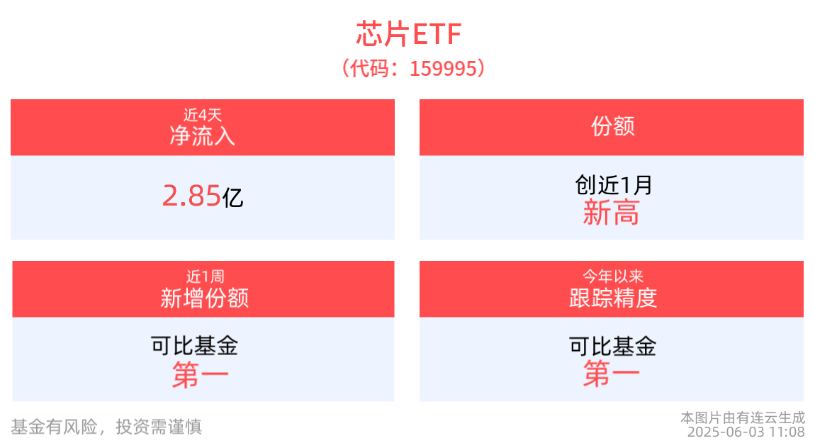 跟蹤精度方面,截至2025年5月30日,芯片ETF今年以來跟蹤誤差為0.007%,在可比基金中跟蹤精度最高。