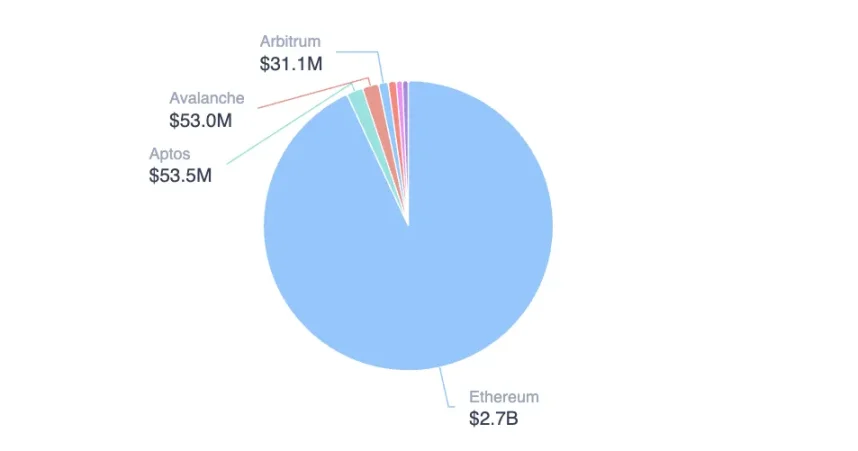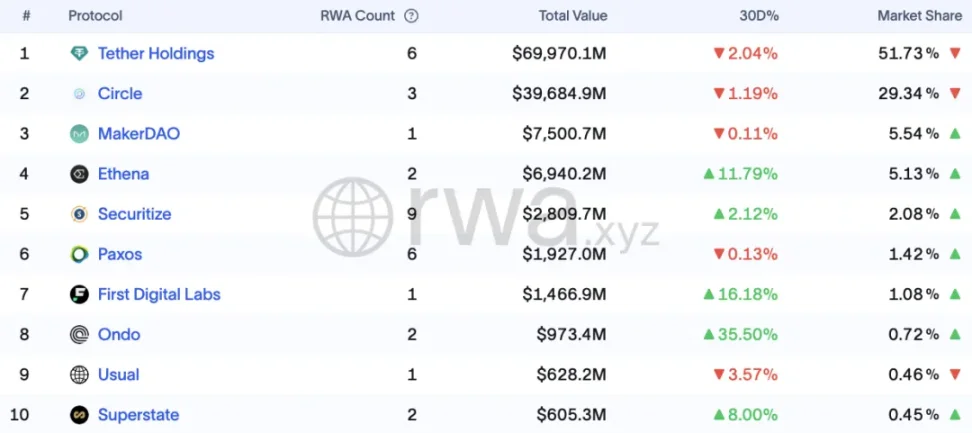 從協議維度觀察,當前主導者主要為穩定幣發行方——前四大協議依次為 Tether、Circle、MakerDAO(Dai 穩定幣體係)和 Ethena。值得關注的是,證券化協議 Securitize 的總價值已顯著超越 FDUSD、USDC 等部分穩定幣項目,躍居前列。其他躋身十強的證券類協議還包括 Ondo 與 Superstate。