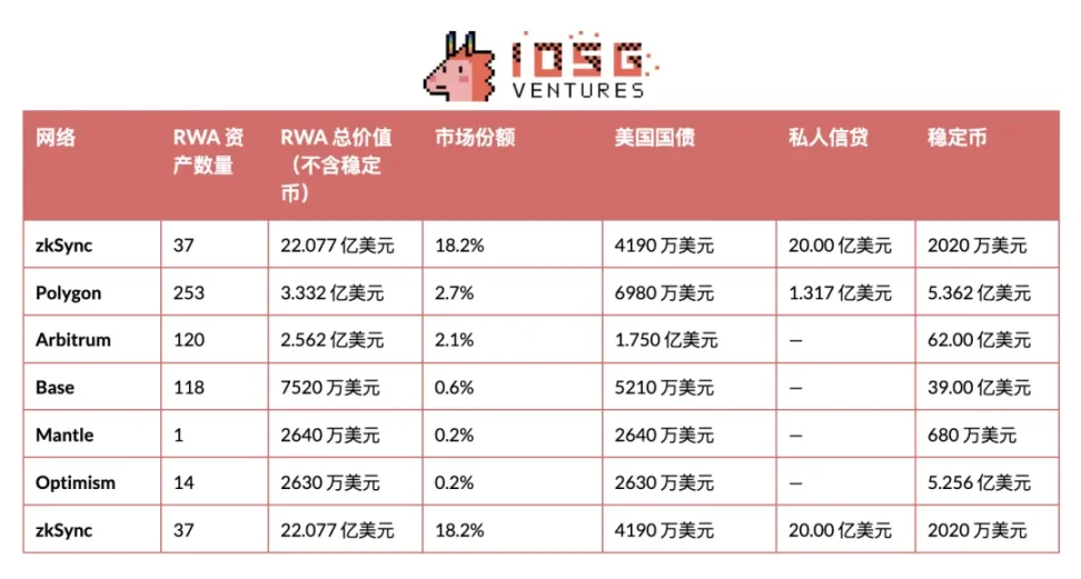 將視野擴展至整個 L2 生態體係,各網絡 RWA 價值與市場份額呈現顯著分化(見下表)。除 zkSync 外,僅 Polygon 與 Arbitrum 形成實質規模效應,其餘 L2 仍處早期發展階段。Polygon 與 Arbitrum 的成功高度依賴單一驅動力 Spiko——該項目在兩條網絡中均貢獻約三分之一的 RWA 總價值。