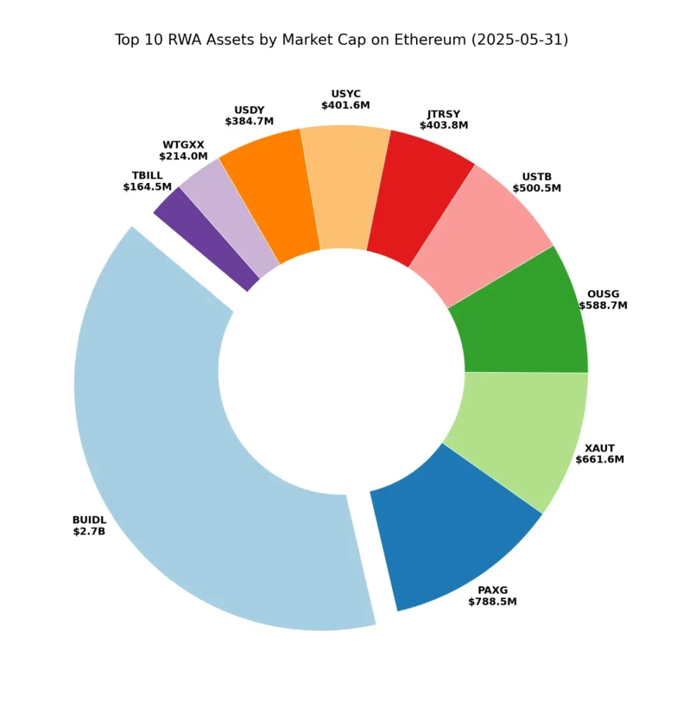 進一步聚焦以太坊 RWA 頭部資産,餅狀圖清晰揭示 BUIDL 的統治地位。回溯一年前對比可見:彼時 BUIDL 規模尚與 PAXG、XAUT 等産品相當,如今已形成顯著超越。盡管十大頭部項目構成基本穩定,但國債類産品增速顯著領先於黃金類産品,市場份額持續擴大。