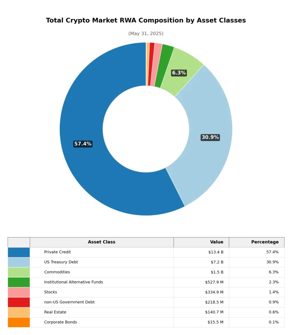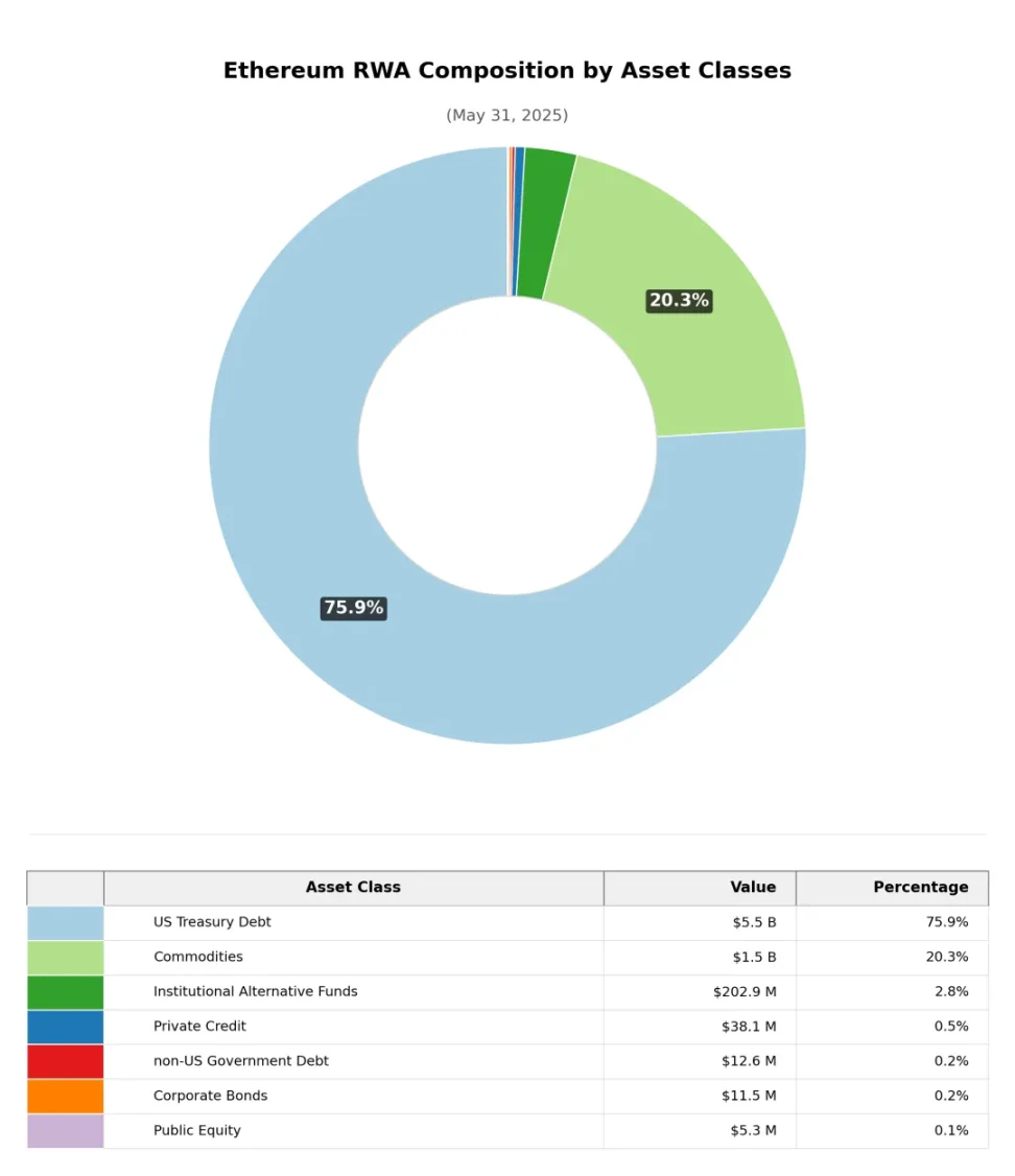 按資産類別劃分(穩定幣除外),以太坊上的真實世界資産(RWA)市值高度集中於兩個主要品類:國債類項目(75.9%)和大宗商品類(以黃金為主,20.3%),其他類別佔小。相比之下,在整個加密市場的 RWA 市值構成中,私募信貸佔比最高(57.4%),國債類項目次之(30.9%)。