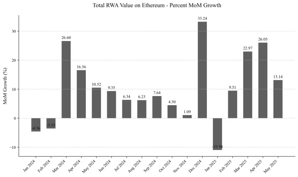 聚焦 2024 年初至今的月度數據,增長浪潮始於 2024 年 4 月,當月實現 26.6% 的驚人漲幅——單月貢獻以太坊 RWA 總增量的四分之一。此動能延續至後續三個月,雖在 2024 年 8 至 12 月期間略有放緩,但網絡仍保持約 2 億美元 / 月的增量(環比增速約 5%,年化超 60%)。