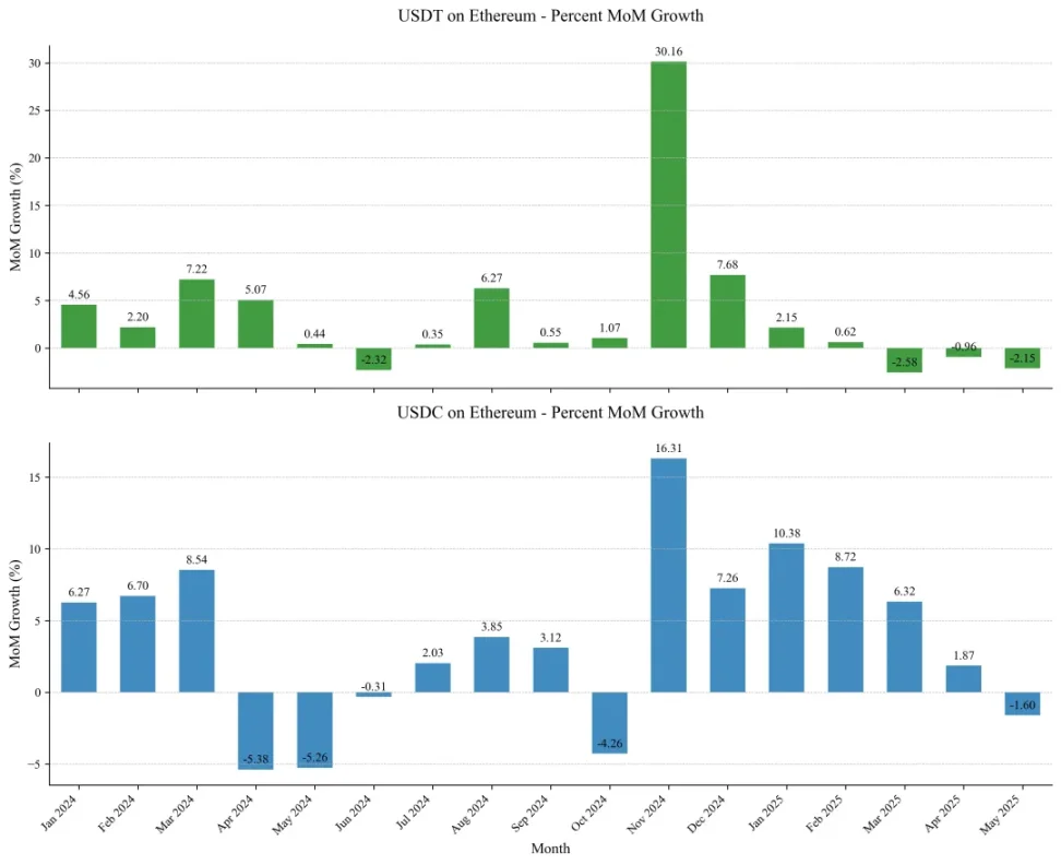 2024 年 11 月的增長尤為值得關注:USDT 當月環比激增 30.16%,USDC 實現 16.31% 增長。 此次飙升後仍有持續數月的增長,USDC 在後續月份增長更穩健,月增長皆在 5% 以上。據發行方披露:Tether 將此歸因於「交易所與機構交易台為應對預期交易量激增而湧入的抵押資産潮」;Circle 則強調「USDC 流通量同比增長 78%... 除用戶需求外,也源於新興穩定幣監管規則催生的市場信心重建與標準體係完善」。