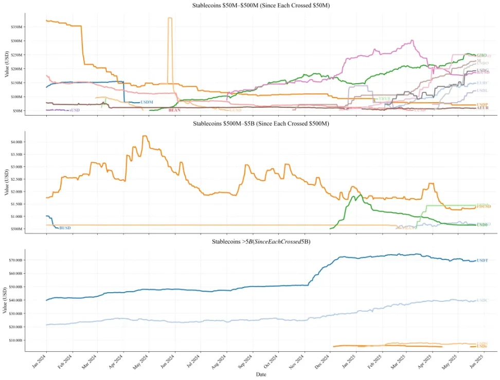 中型項目(5-50 億美元)在 2024 年僅有 FDUSD 和 FRAX;BUSD 因終止發行,從 2024 年 1 月的 10 億美元驟降至 3 月不足 5 億美元。但在 2025 年,USD0 與 PYUSD 雙雙突破 5 億美元門檻,中型穩定幣更加多元。