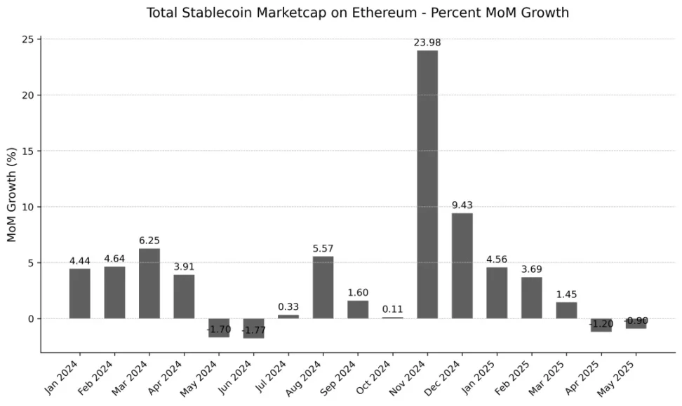 2025 年 1 月增速再度爆發,環比飙升 33.2%。經歷 2 月短暫回調後,以太坊連續四個月維持兩位數增長,其中 4 月與 5 月環比增幅均突破 20% 大關。