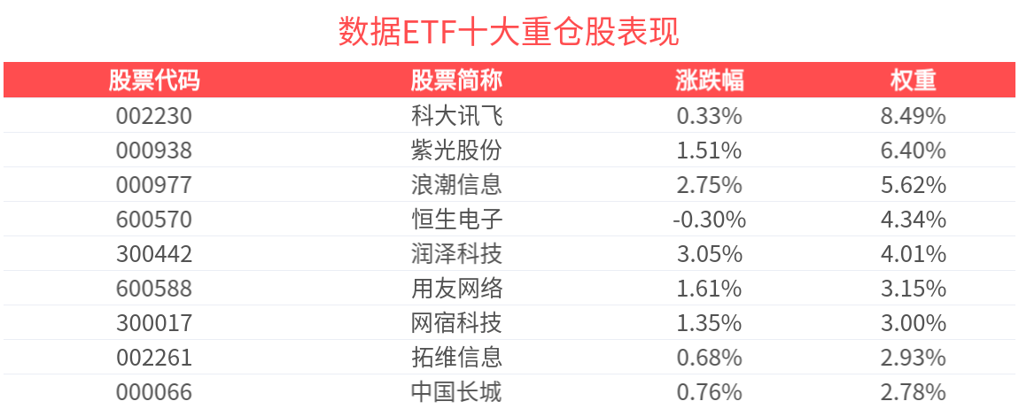 數據顯示,截至2025年5月30日,中證大數據産業指數(930902)前十大權重股分別為科大訊飛(002230)、中科曙光(603019)、紫光股份(000938)、浪潮信息(000977)、恒生電子(600570)、潤澤科技(300442)、拓維信息(002261)、中國長城(000066)、用友網絡(600588)、中國軟件(600536),前十大權重股合計佔比50.5%。