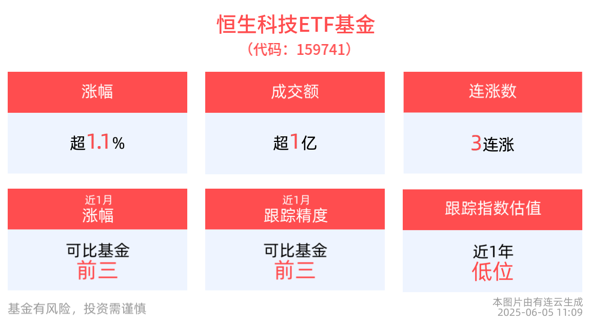 截至2025年6月5日 11:09,恒生科技指數強勢上漲1.33%,成分股快手-W上漲4.91%,閱文集團上漲4.49%,商湯-W上漲3.68%,美團-W、阿裡巴巴-W等個股跟漲。恒生科技ETF基金(159741)上漲1.15%, 沖擊3連漲。