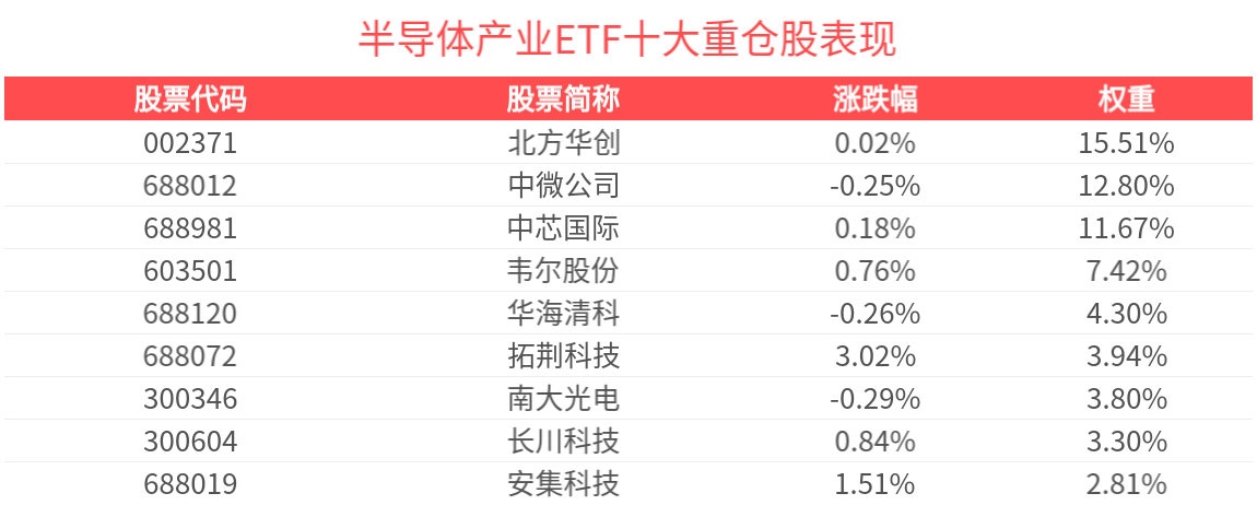 數據顯示,截至2025年5月30日,中證半導體産業指數(931865)前十大權重股分別為北方華創(002371)、中微公司(688012)、中芯國際(688981)、海光信息(688041)、韋爾股份(603501)、南大光電(300346)、華海清科(688120)、拓荊科技(688072)、長川科技(300604)、安集科技(688019),前十大權重股合計佔比75.47%。