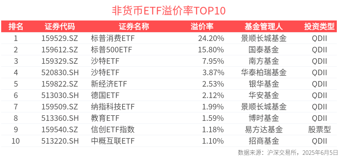 截至今日收盤,標普500消費精選指數溢價居前,標普消費ETF收盤溢價24.20%;標普500指數情緒高漲,標普500ETF收盤溢價15.80%。