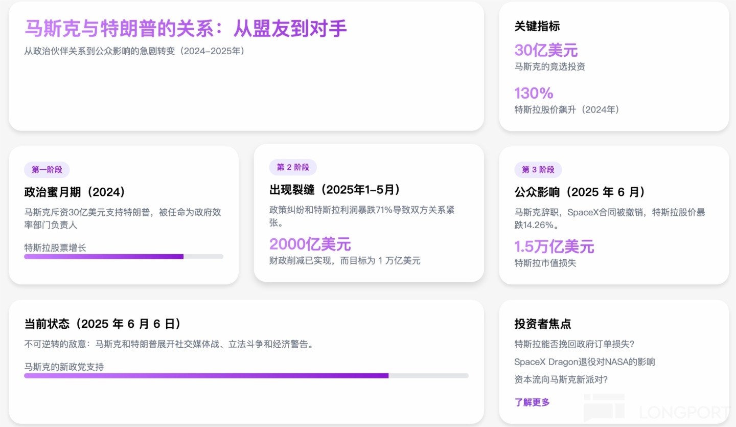 由於馬斯克和特朗普因擬議稅收立法産生分歧並隔空 「互噴」,6 月 5 日,$特斯拉(TSLA.US)股價暴跌 14%,市值蒸發 1530 億美元,創下單日最大跌幅紀錄,據 S3 Partners 數據,空頭在這一波下跌中獲利 40 億美元。現在馬斯克與特朗普表面上的 「兄弟情」 已經正式決裂,讓我們看看馬斯克與特朗普關係如何由蜜月走向決裂: