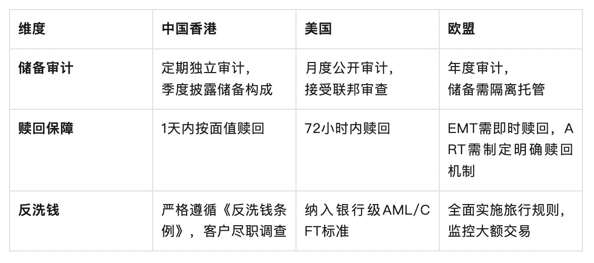結合搜集到的公開信息,我們從立法目的、監管範圍、監管主體、發行主體、發行程序、監管要求、使用場景及域外監管等角度,對中國香港、美國、歐盟的穩定幣相關要求進行綜合比較分析。