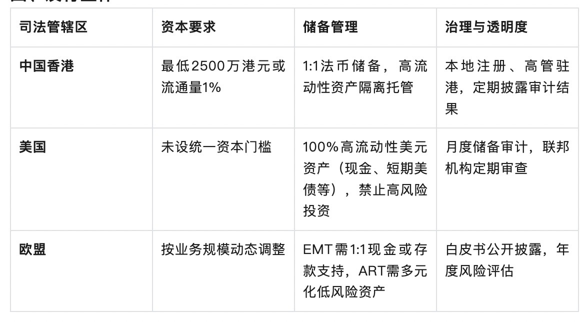 三大司法管轄區的穩定幣制度體現了不同的戰略導向:香港側重開放與兼容,美國強化美元主導,歐盟追求統一與安全。未來,合規穩定幣將成為鏈上經濟的基礎設施,但其監管競爭也可能加劇全球金融體係的碎片化。企業需根據業務重心選擇合規路徑,例如跨境場景可選香港,美元清算聚焦美國,歐洲市場則需符合 MiCA 標準。