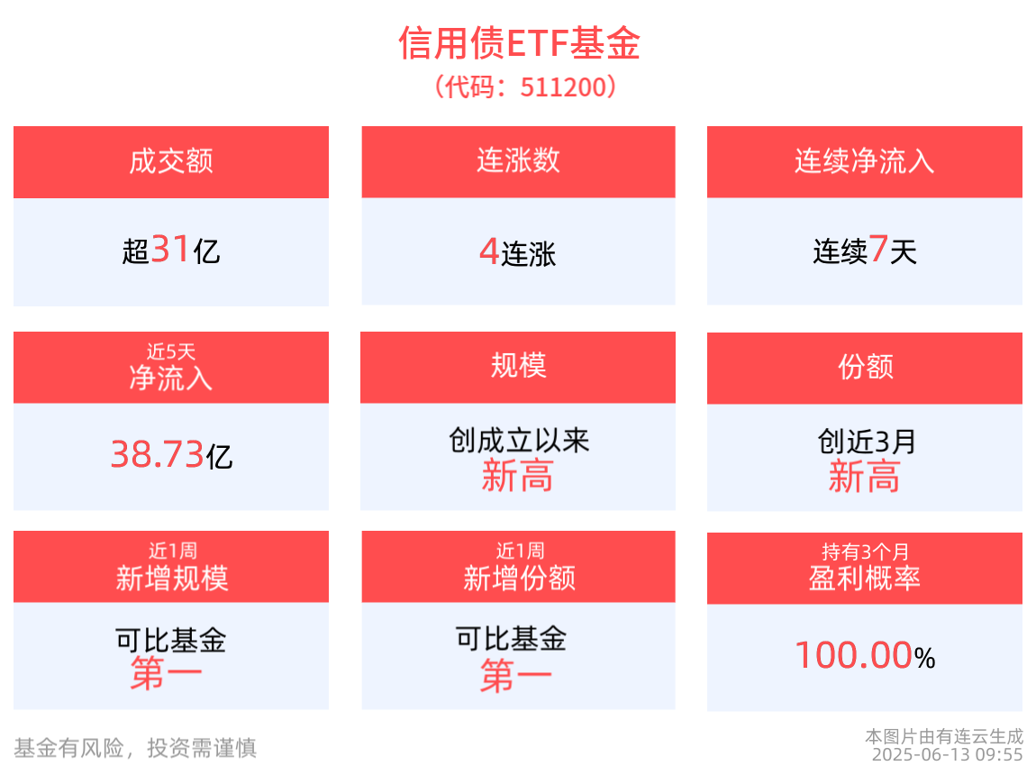 從資金淨流入方面來看,信用債ETF基金近7天獲得連續資金淨流入,合計「吸金」43.56億元,日均淨流入達6.22億元。規模方面,信用債ETF基金最新規模達113.88億元,創成立以來新高。