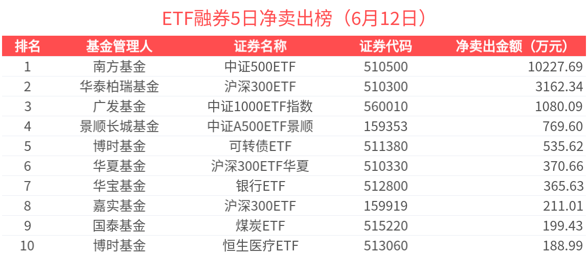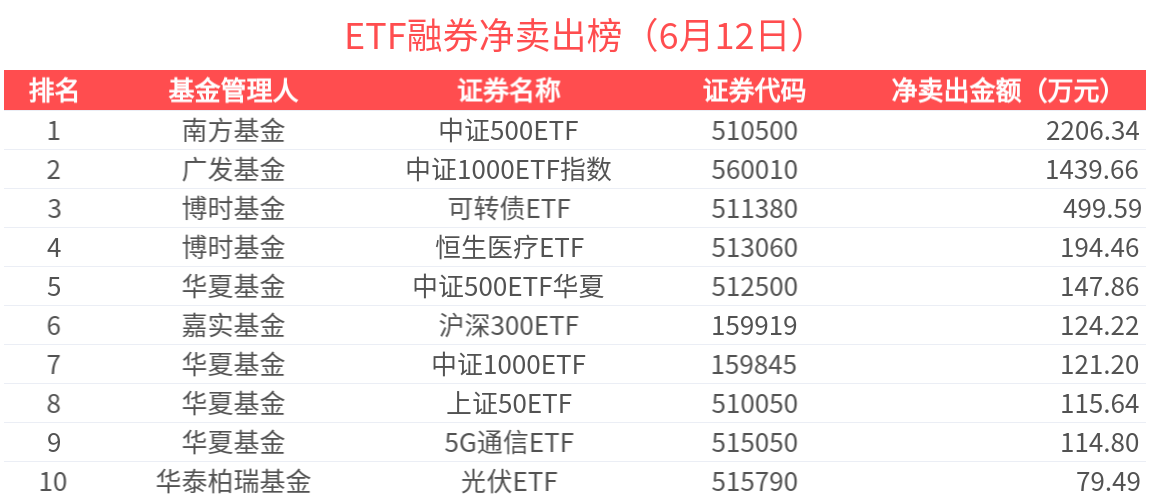 融券淨賣出金額超500萬元的有2只,中證500ETF(510500.SH)、中證1000ETF指數(560010.SH)槓桿資金顯著流出,分別淨流出2206.34萬元、1439.66萬元。
