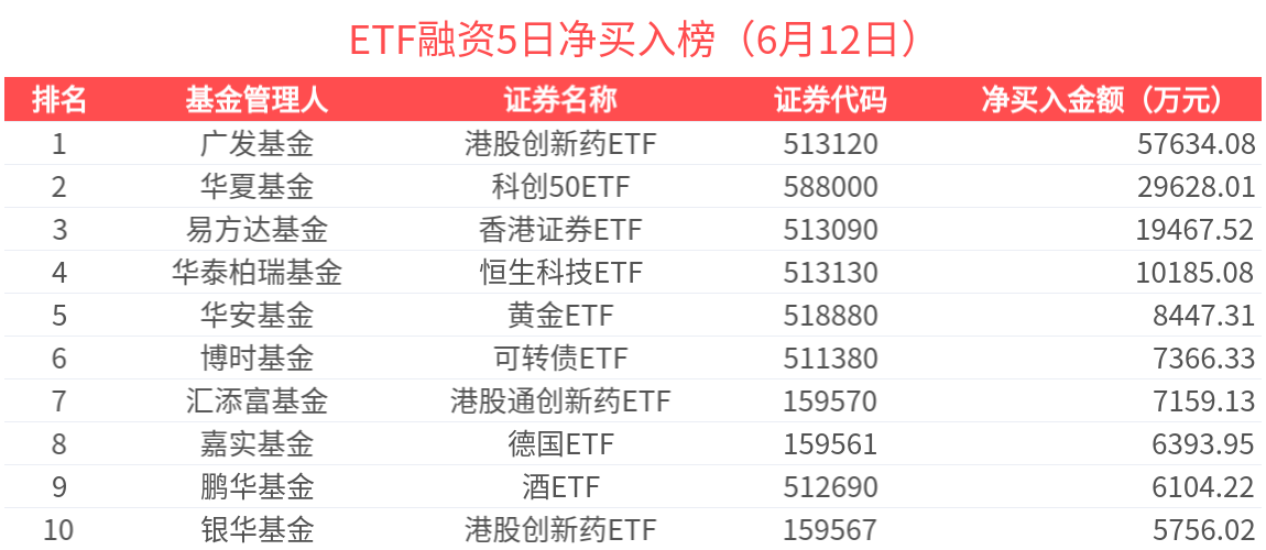 拉長時間看,近5天獲槓桿資金融資淨買入超過500萬元的有55只,金額居前的為港股創新藥ETF、科創50ETF、香港證券ETF、恒生科技ETF、黃金ETF等,分別淨流入5.76億元、2.96億元、1.95億元、1.02億元、8447.31萬元。其中,科創50ETF近5天獲槓桿資金大幅融資淨買入,達到成交額的2.98%。