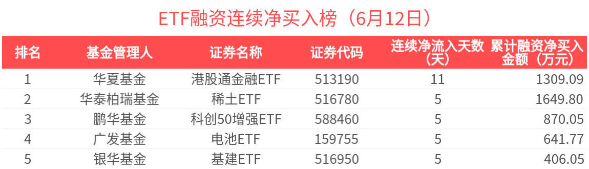 近期獲槓桿資金連續融資淨買入的ETF基金有81只,居前的為港股通金融ETF(11天)、稀土ETF(5天)、科創50增強ETF(5天)、電池ETF(5天)、基建ETF(5天)等,分別淨買入1309.09萬元、1649.80萬元、870.05萬元、641.77萬元、406.05萬元。其中,港股通金融ETF近11天獲槓桿資金加速買入,近11天槓桿資金累計流入1309.09萬元。