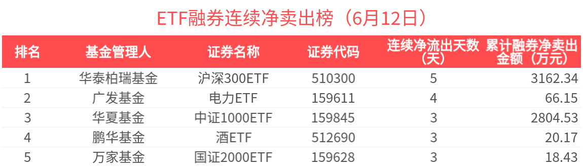 近期獲槓桿資金連續融券淨賣出的ETF基金有17只,居前的為滬深300ETF(5天)、電力ETF(4天)、中證1000ETF(3天)、酒ETF(3天)、國證2000ETF(3天)等,分別淨賣出3162.34萬元、66.15萬元、2804.53萬元、20.17萬元、18.43萬元。其中,電力ETF近4天獲槓桿資金加速流出,近4天槓桿資金累計流出66.15萬元。