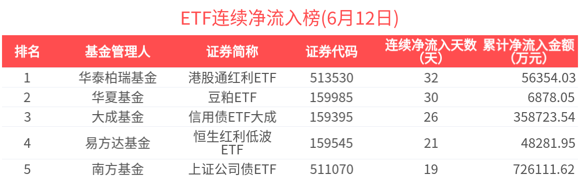 近期連續淨流入的ETF基金有93只,居前的為港股通紅利ETF(32天)、豆粕ETF(30天)、信用債ETF大成(26天)、恒生紅利低波ETF(21天)、上證公司債ETF(19天),分別淨流入5.64億元、6878.05萬元、35.87億元、4.83億元、72.61億元。其中,港股通紅利ETF近32天加速流入,近32天累計流入5.64億元,基金規模快速增長至22.60億元。