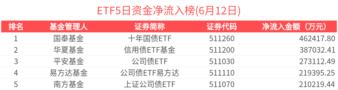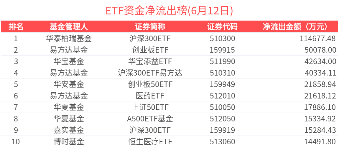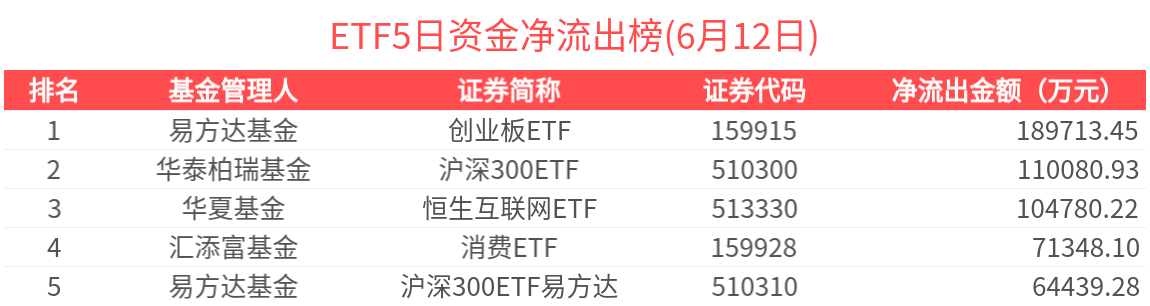 2025年6月12日共188只ETF基金獲資金淨流入,419只ETF基金淨流出。淨流入金額超1億元的有19只,酒ETF(512690.SH)、科創50ETF(588000.SH)、半導體ETF(512480.SH)、恒生科技ETF(513130.SH)、十年國債ETF(511260.SH)資金顯著流入,分別淨流入4.14億元、3.05億元、2.99億元、2.99億元、2.87億元(淨申購份額*單位淨值)。