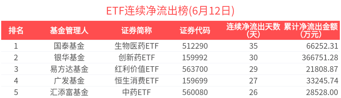連續淨流出的ETF基金有266只,居前的為生物醫藥ETF(35天)、創新藥ETF(30天)、紅利價值ETF(29天)、恒生消費ETF(27天)、中藥ETF(26天),分別淨流出6.63億元、36.68億元、2.18億元、3.32億元、2.85億元。其中,生物醫藥ETF近35天加速流出,近35天累計流出6.63億元,基金規模快速下降至36.12億元。