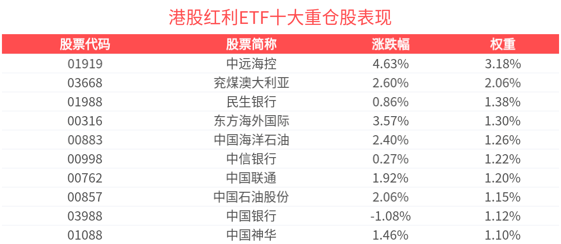 數據顯示,截至2025年5月30日,中證港股通高股息投資指數前十大權重股分別為中遠海控、兗煤澳大利亞、東方海外國際、民生銀行、中信銀行、海豐國際、國泰海通、中國石油股份、中國海洋石油、中國神華,前十大權重股合計佔比46.26%。
