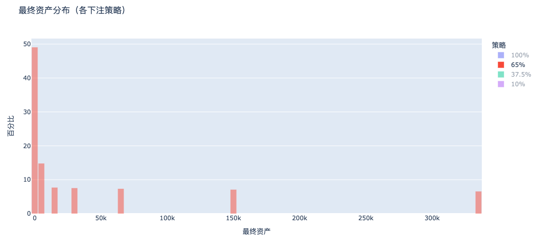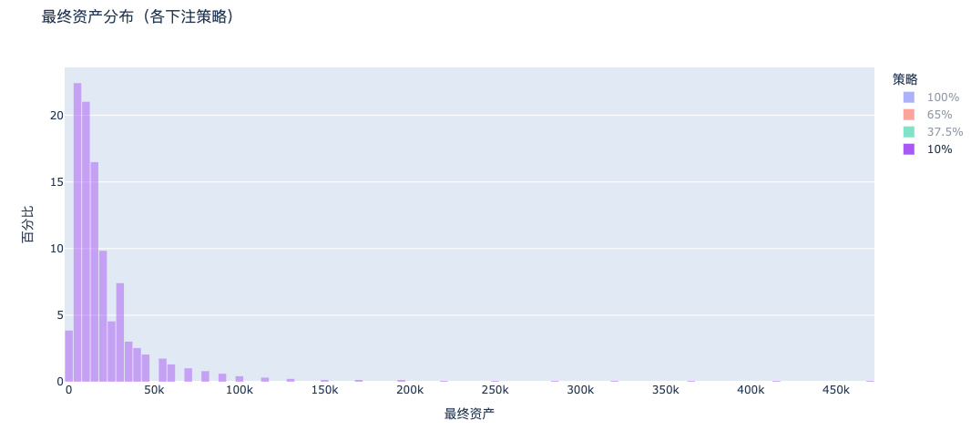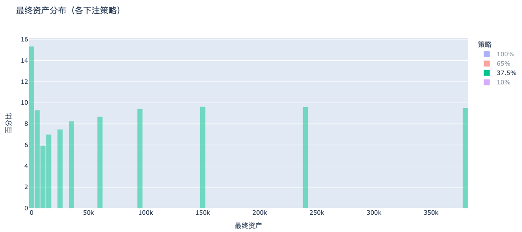 沒有了類似全押情況下的破産分佈尖峰,但整體財富集中在低資産區。相比之下,37.5% 策略會在右側拉出明顯長尾,實現資産倍增。
