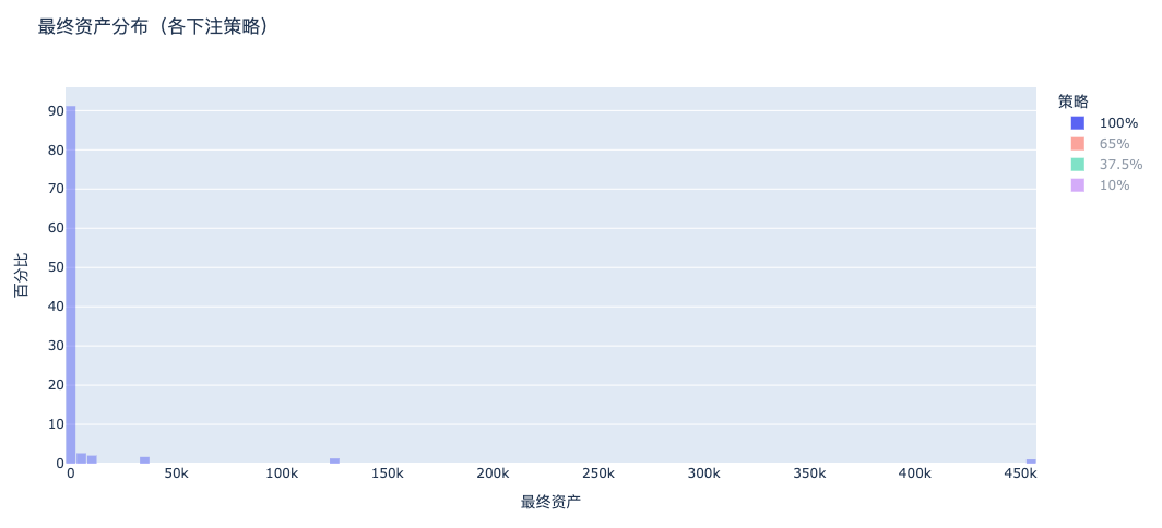全押策略下的最終資産分佈有龐大的左側貧困峰 + 極細的右側暴富尾結構:大部分人破産,極少數人賺走所有的錢,這就是博弈不對稱性 + 幸存者偏差的真實呈現。
