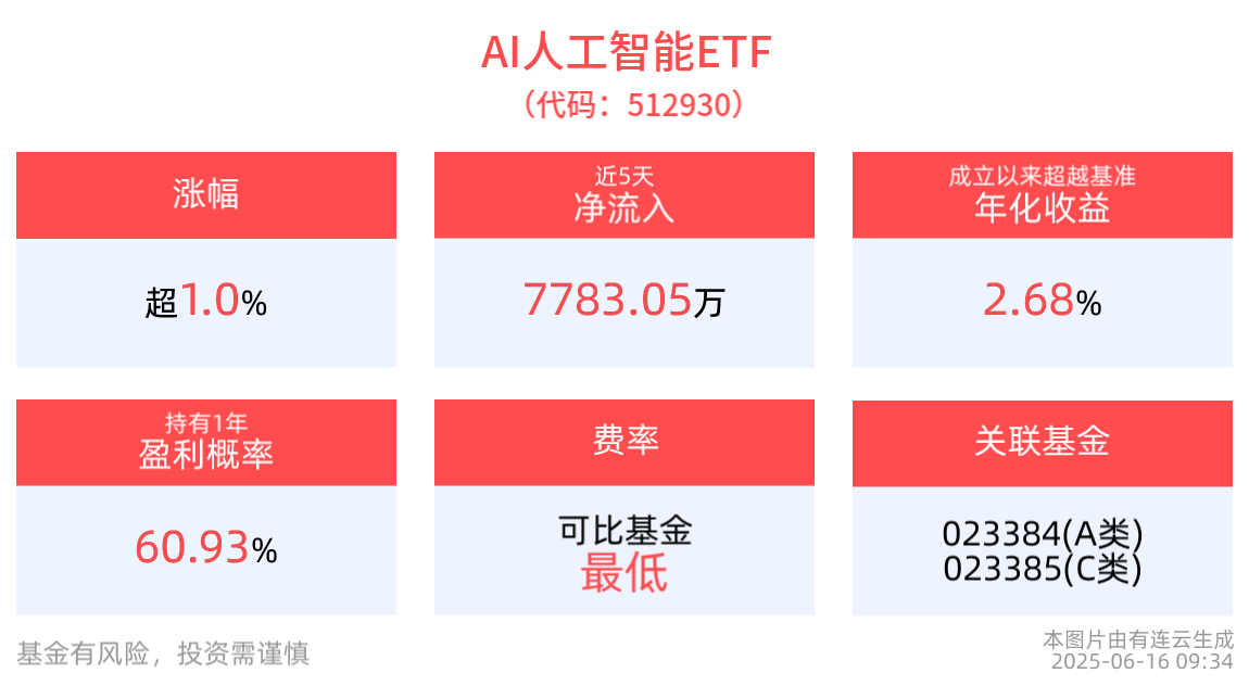 截至2025年6月16日 09:34,中證人工智能主題指數(930713)上漲0.83%,成分股新易盛(300502)上漲4.08%,中際旭創(300308)上漲3.99%,潤澤科技(300442)上漲3.08%,光迅科技(002281)上漲1.84%,瀾起科技(688008)上漲1.71%。AI人工智能ETF(512930)上漲1.00%,最新價報1.31元。拉長時間看,截至2025年6月13日,AI人工智能ETF近2周累計上漲1.56%。
