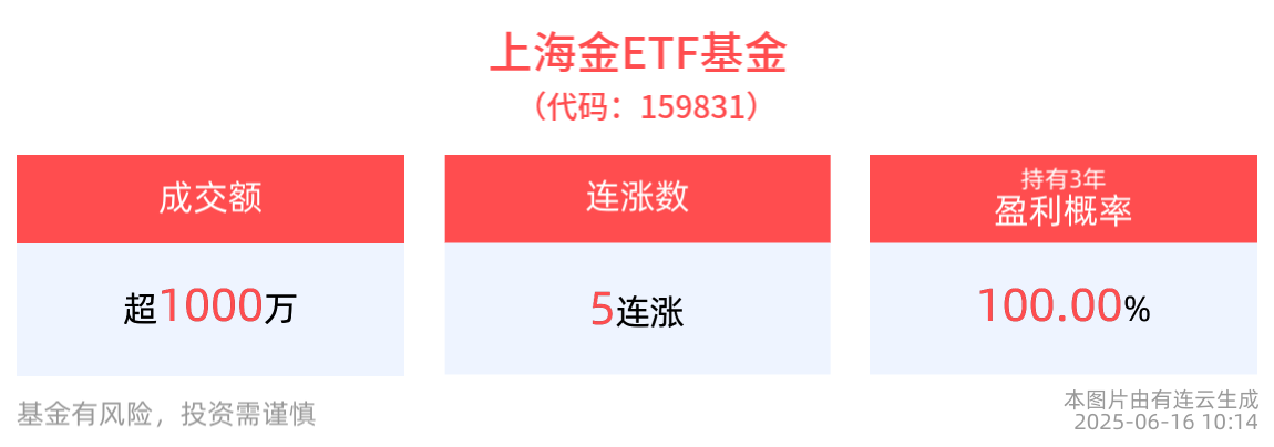 近日,區域沖突引發國際避險情緒升溫,黃金價格再度突破。6月13日,國際金價漲超1%,突破每盎司3400美元,國内黃金價格同步上漲,最高突破每克800元。截至2025年6月16日 10:14,上海金ETF基金(159831)上漲0.59%, 沖擊5連漲。