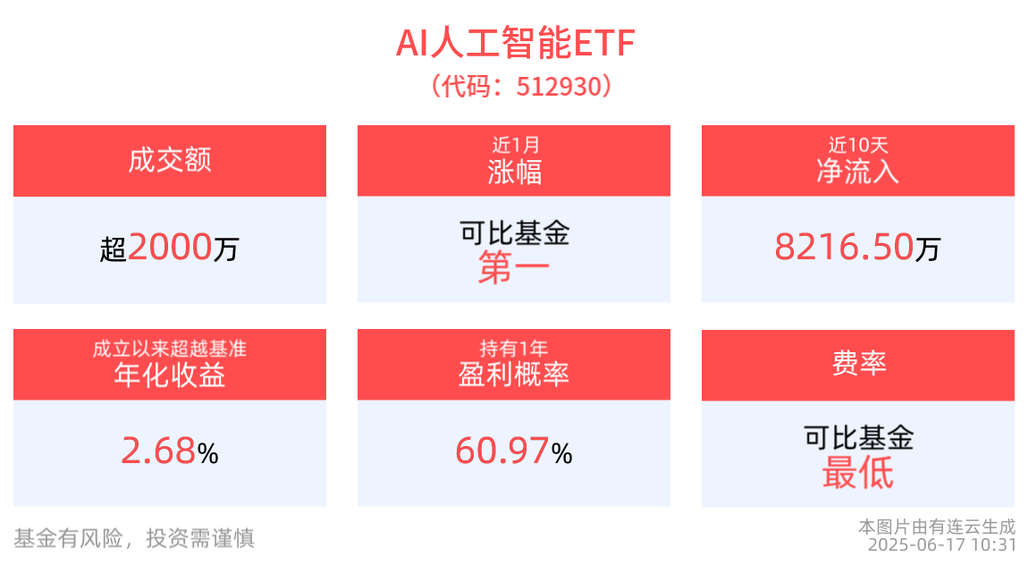 流動性方面,AI人工智能ETF盤中換手1.19%,成交2426.48萬元。拉長時間看,截至6月16日,AI人工智能ETF近1年日均成交8930.53萬元。