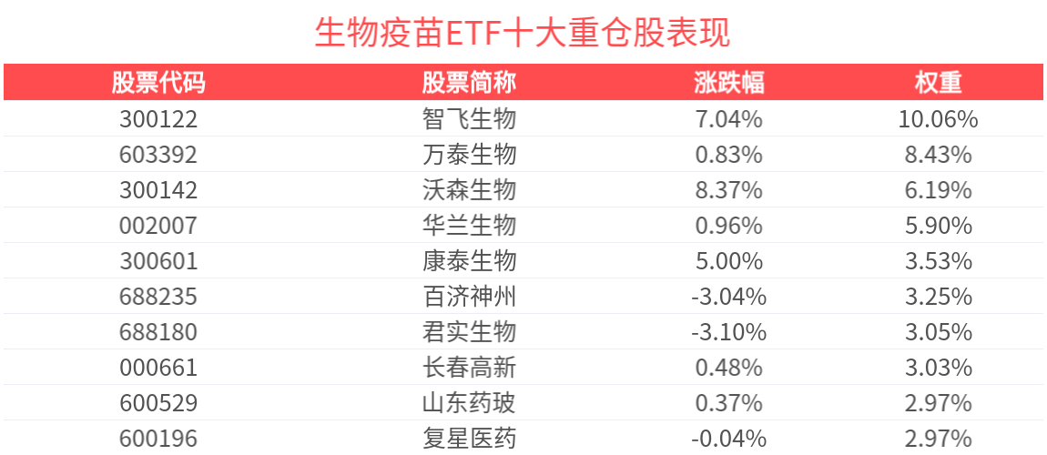 數據顯示,截至2025年5月30日,中證疫苗與生物技術指數(931992)前十大權重股分別為萬泰生物、智飛生物、華蘭生物、沃森生物、甘李藥業、康泰生物、君實生物、長春高新、百濟神州、復星醫藥,前十大權重股合計佔比47.19%。