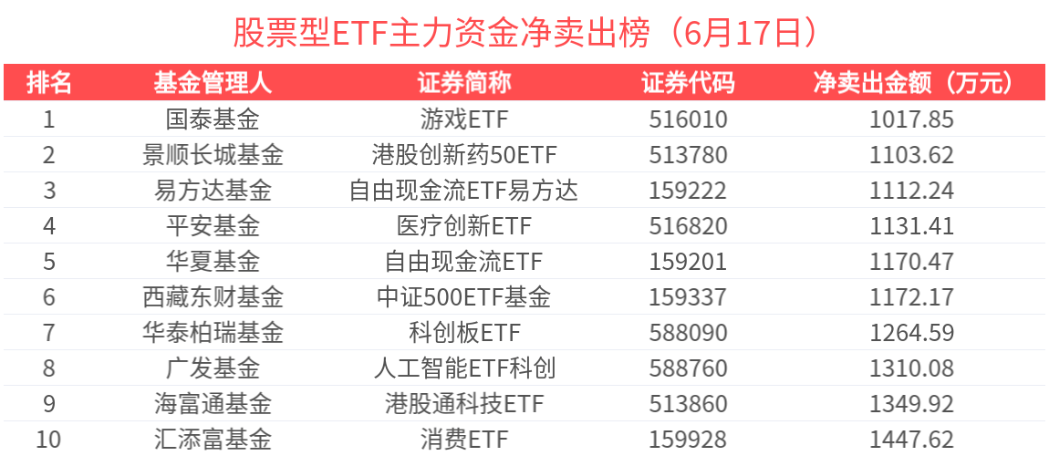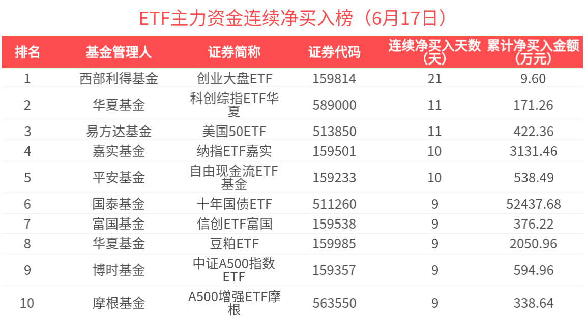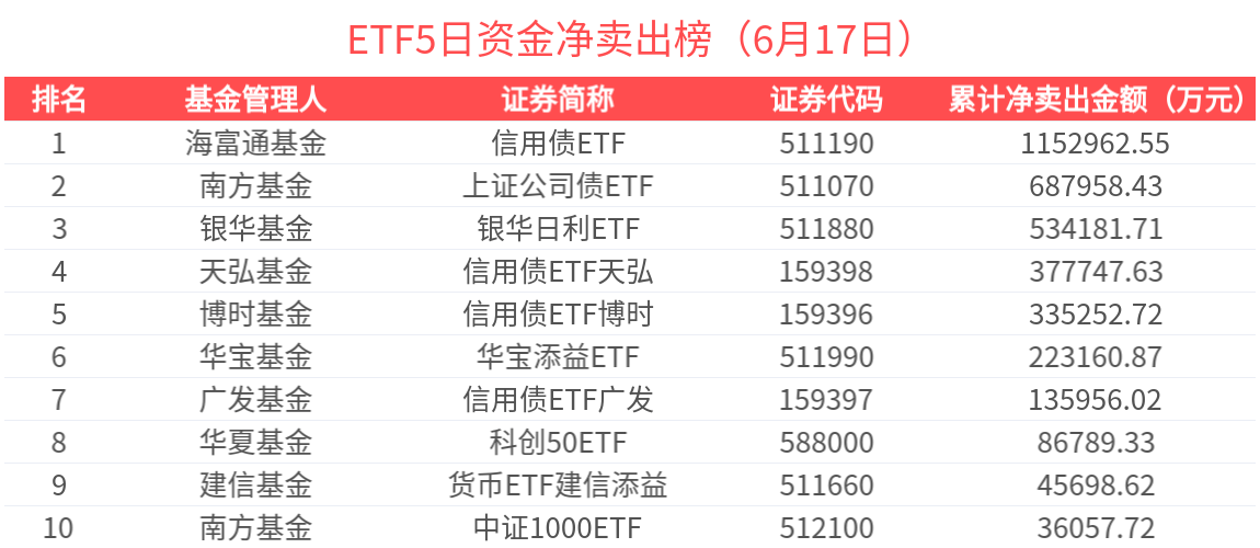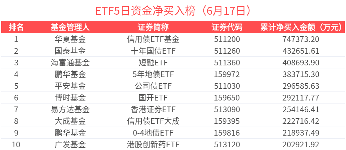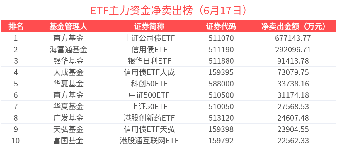 2025年6月17日,共222只ETF基金獲主力資金(單筆成交額100萬元以上)淨買入,273只ETF基金遭主力資金淨賣出。主力資金淨買入金額超1千萬元的ETF基金有66只,信用債ETF基金(511200), 公司債ETF易方達(511110), 公司債ETF(511030), 華寶添益ETF(511990), 基準國債ETF(511100)受到主力資金青睐,分別獲淨買入20.49億元, 20.27億元, 10.15億元, 9.07億元, 7.74億元。