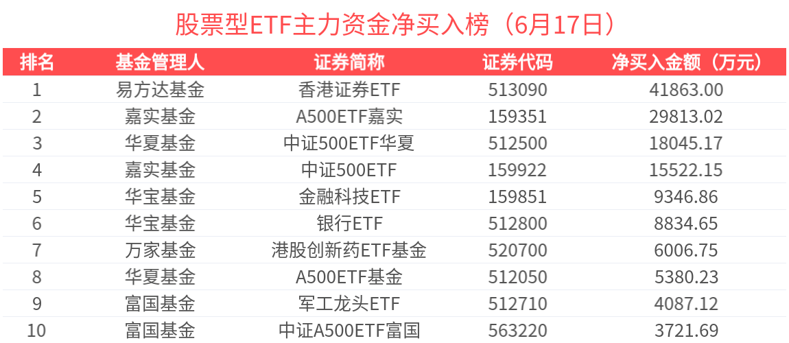 其中,主力資金淨買入金額超1千萬元的股票型ETF基金有28只,香港證券ETF(513090), A500ETF嘉實(159351), 中證500ETF華夏(512500), 中證500ETF(159922), 金融科技ETF(159851)受到主力資金青睐,分別獲淨買入4.19億元, 2.98億元, 1.80億元, 1.55億元, 0.93億元。